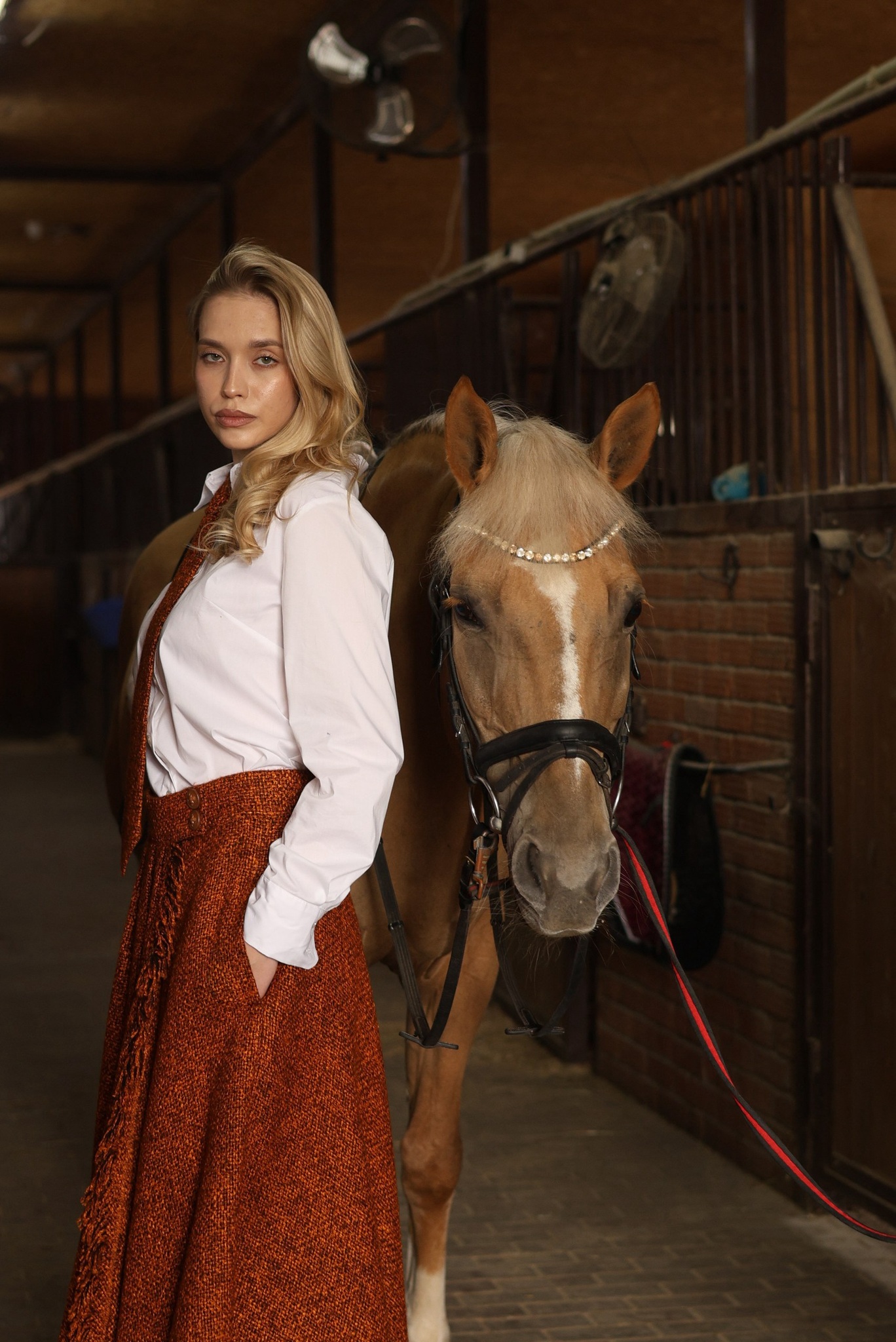 Для элегантного повседневного образа: С приталенным трикотажным джемпером и лакированными лоферами.