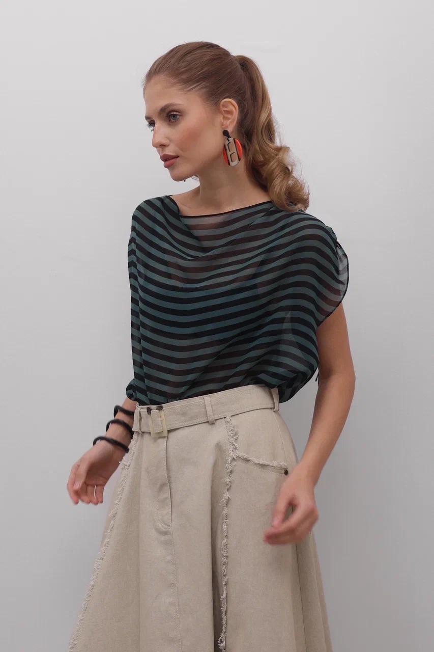 Полупрозрачная блуза в полоску с драпировкой. Легкая блуза из полупрозрачной ткани выполнена в актуальном сочетании черных полос. Короткий рукав и легкая воздушная ткань идеально подойдут для теплого сезона или для многослойных образов.