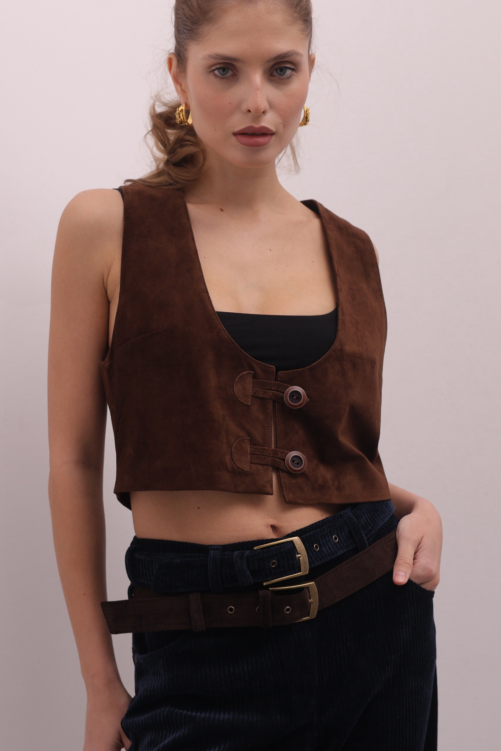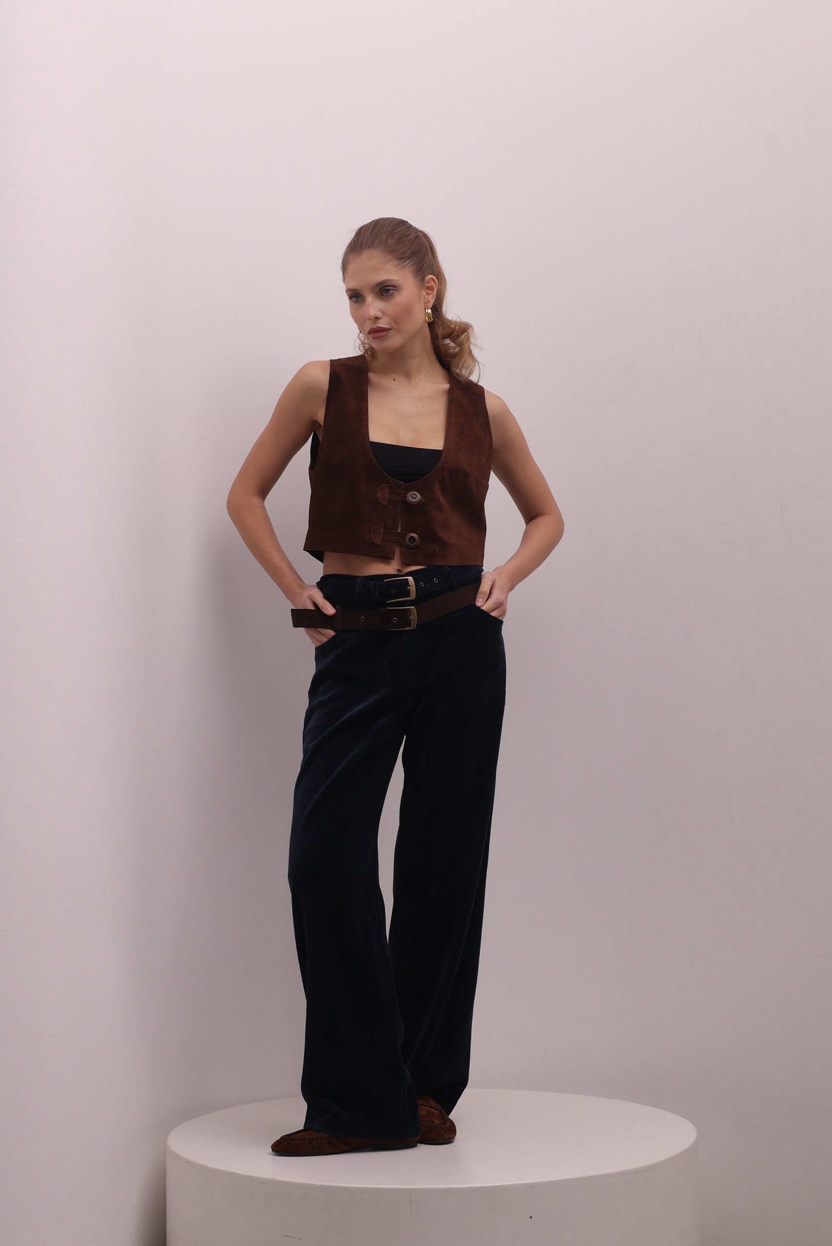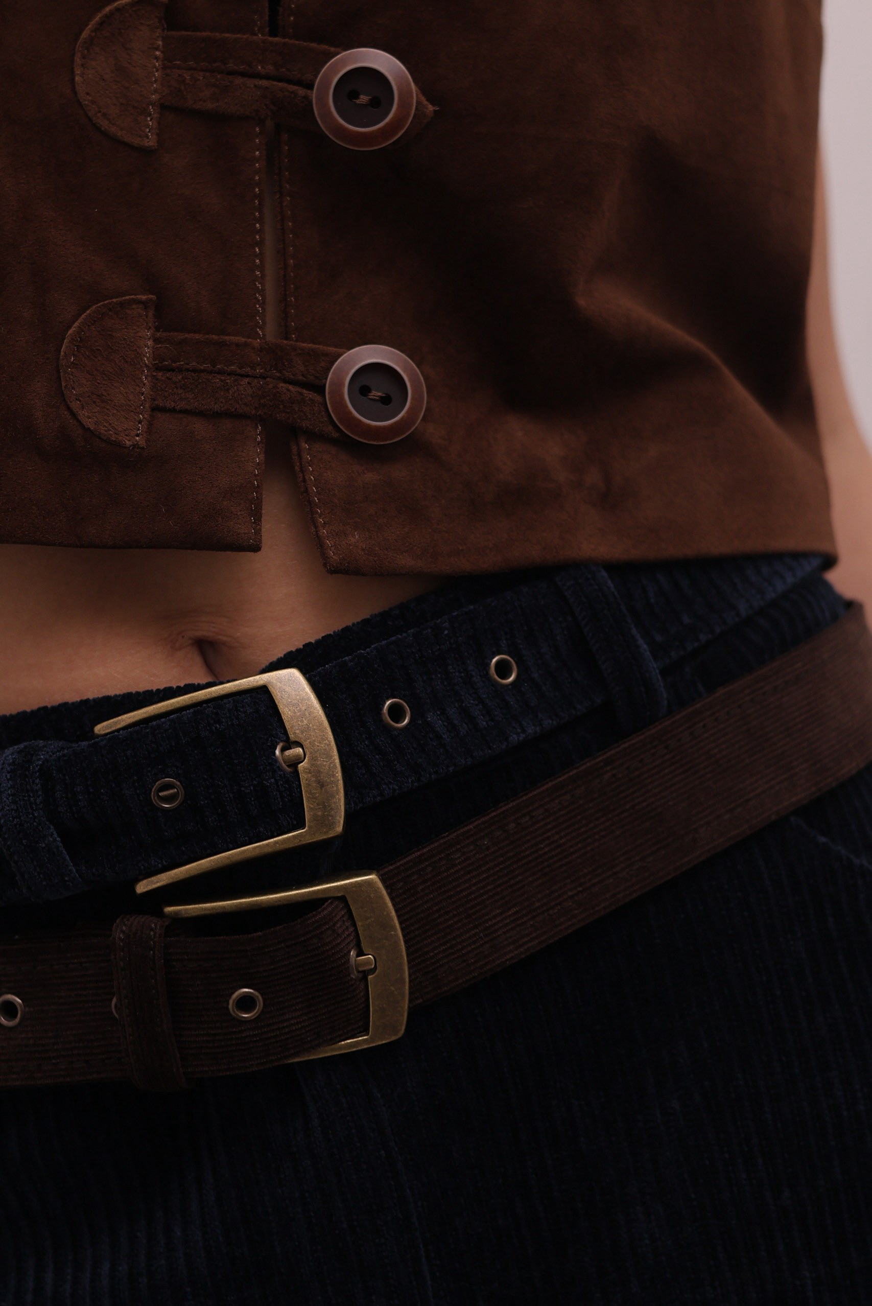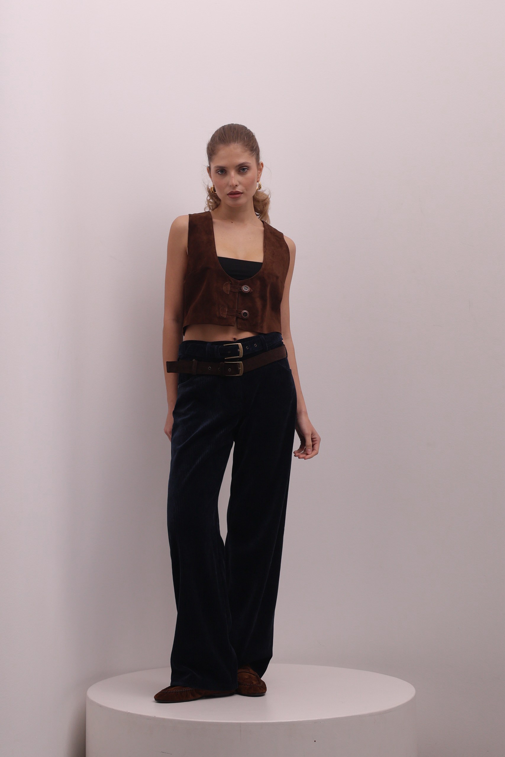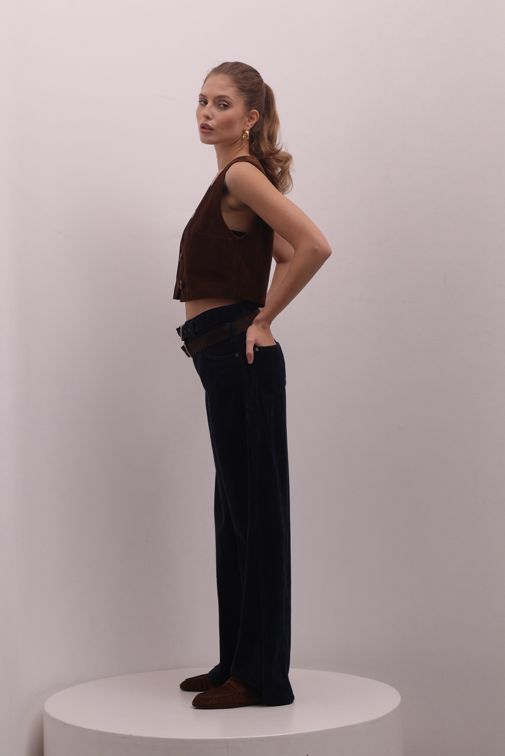 Стильные брюки из мягкого вельвета в глубоком синем оттенке - идеальная база. Модель выполнена из плотного фактурного материала с вертикальным рубчиком, который визуально вытягивает силуэт. Прямой крой делает модель универсальной и удобной в носке. Акцентная деталь -двуцветный контрастный вельветовый ремень в коричневом и синем цвете.