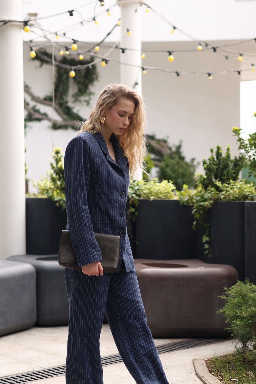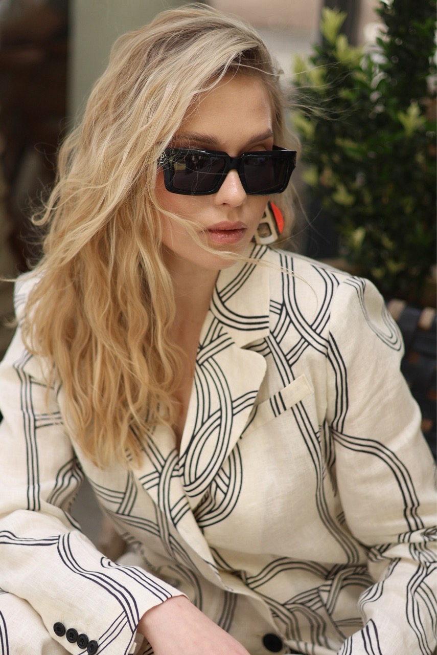 Костюм изо льна с выразительным графичным принтом в современном стиле. Жакет из полуприлегающего силуэта с акцентированной линией плеч, отложным воротником и застежками на пуговицах подчеркивает структура образа. Брюки прямого кроя с комфортной посадкой визуально вытягивают силуэт и обеспечивают свободу движений.