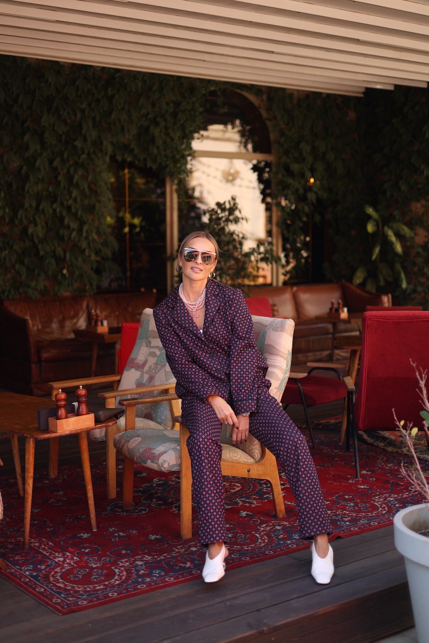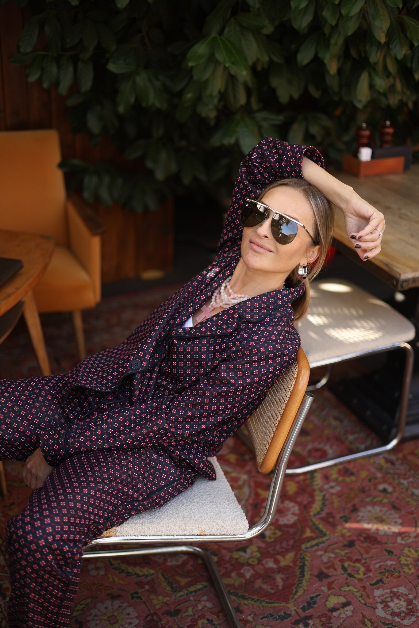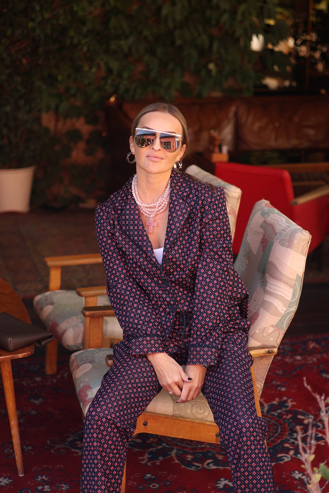 Костюм пижамный с брюками и жакетом. Свободный жакет обработан кантом , а прямые брюки не сковывают движений. Стильный мелкий принт
