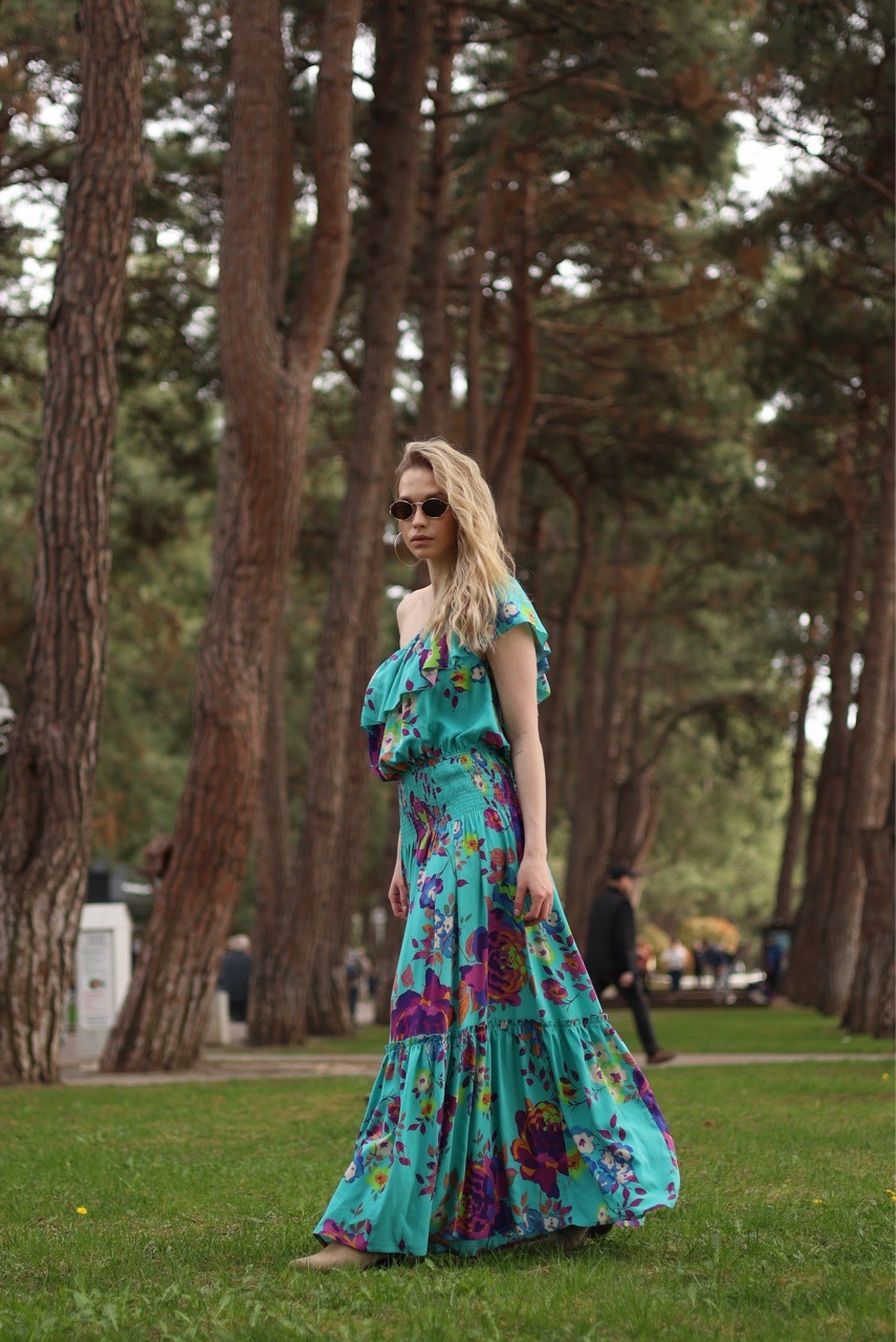 Легкое платье макси из струящейся ткани с ярким цветочным принтом. Модель выполнена на одно плечо с декоративной оборкой, подчеркивающая линию декольте. Приталенный силуэт с эластичной сборкой на талии мягко акцентирует фигуру, а многоярусная юбка с воланами добавляет объем и динамику образу.