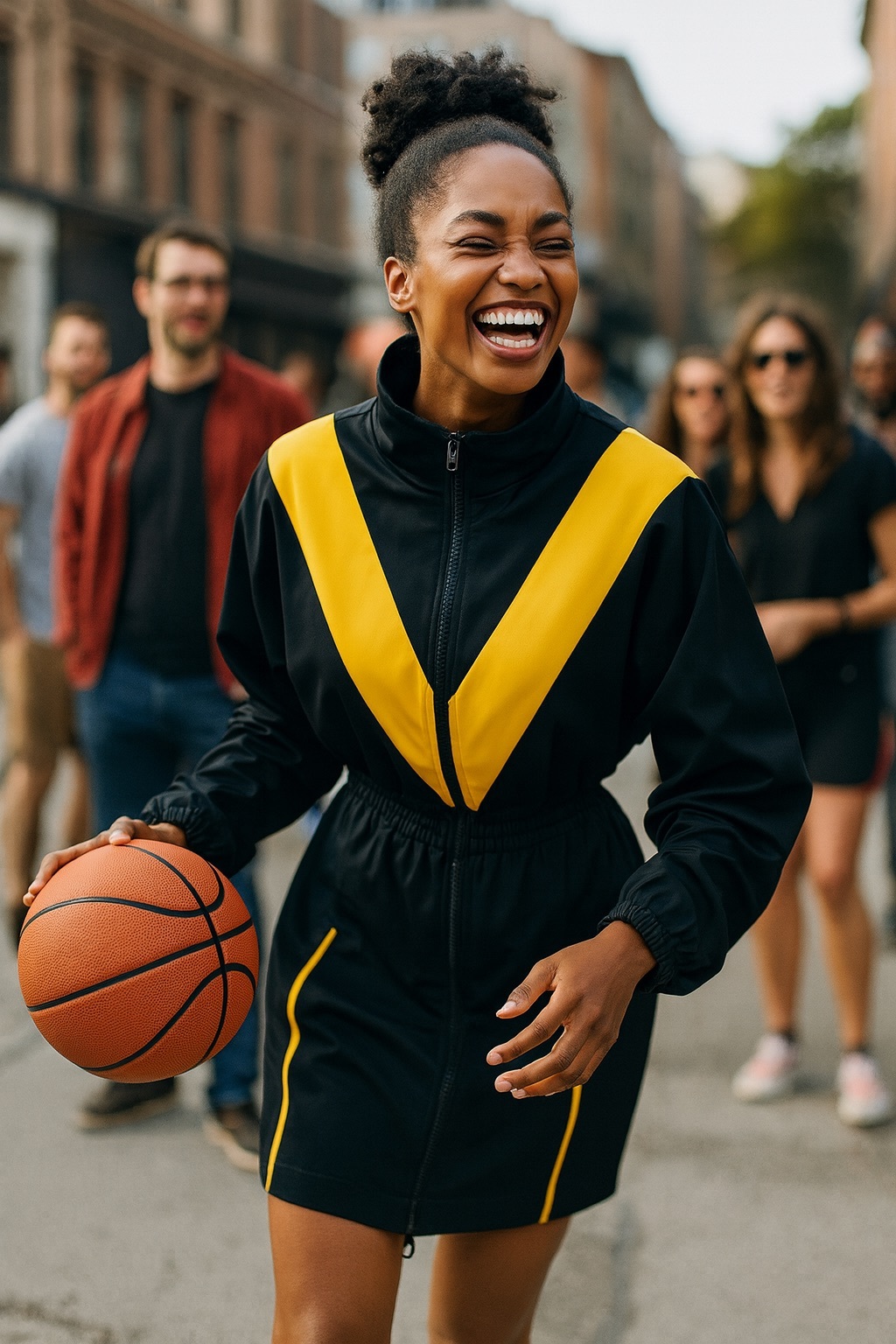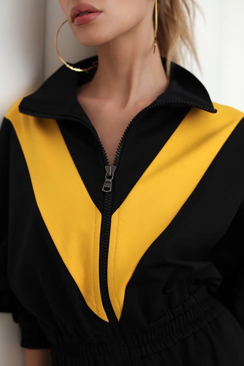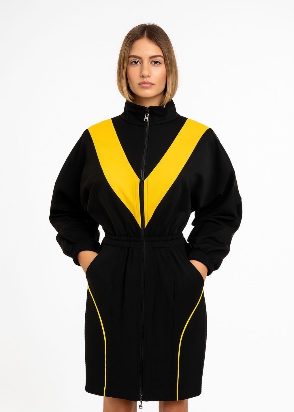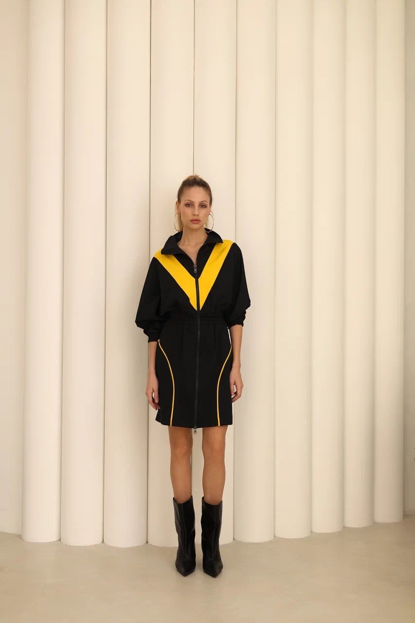 Платье выполнено в черном цвете с яркими желтыми акцентами. Оно имеет прямой силуэт, который подчеркивает фигуру, и длину до колена, что делает его универсальным для разных случаев.