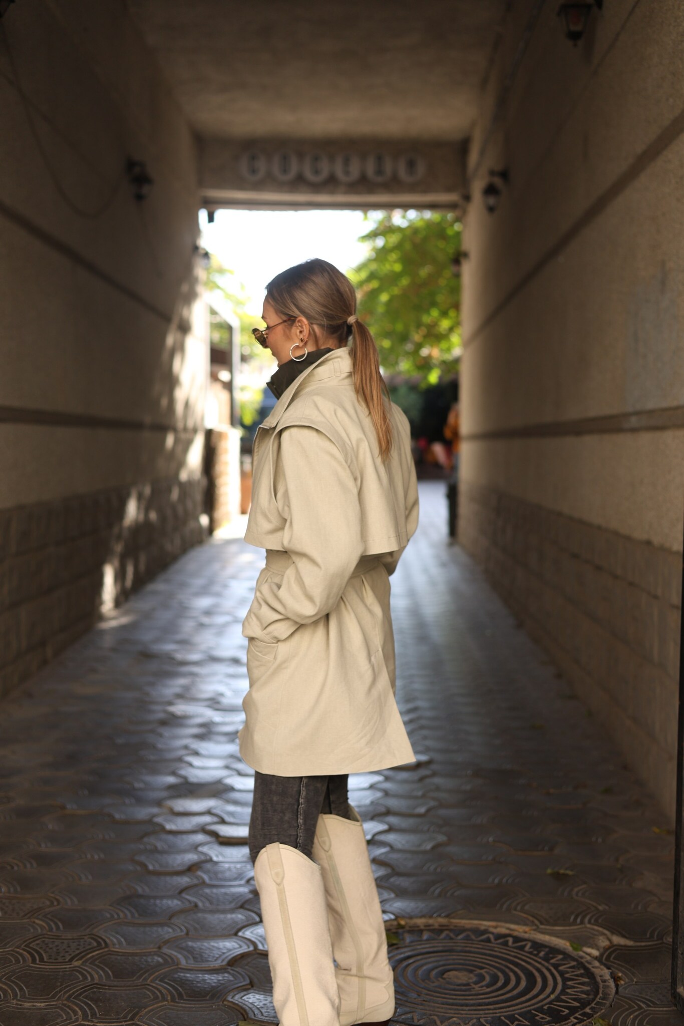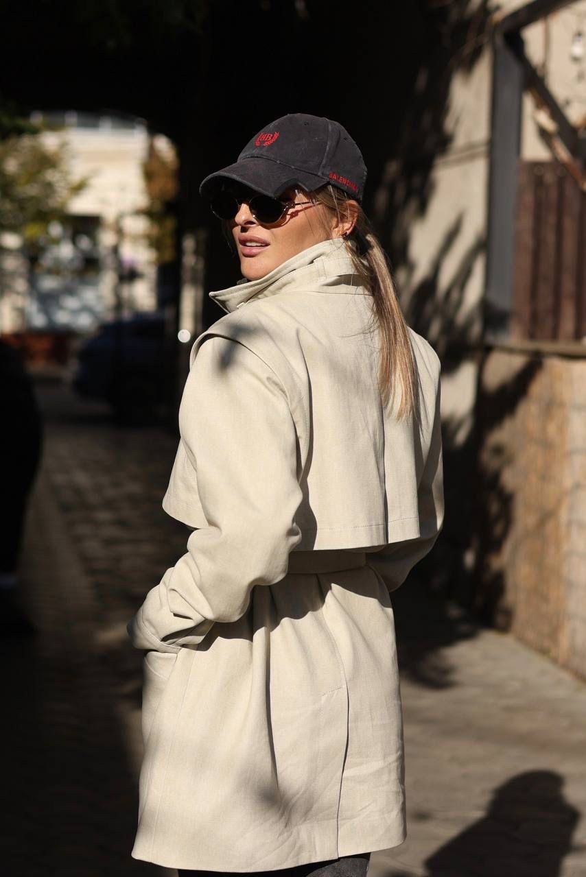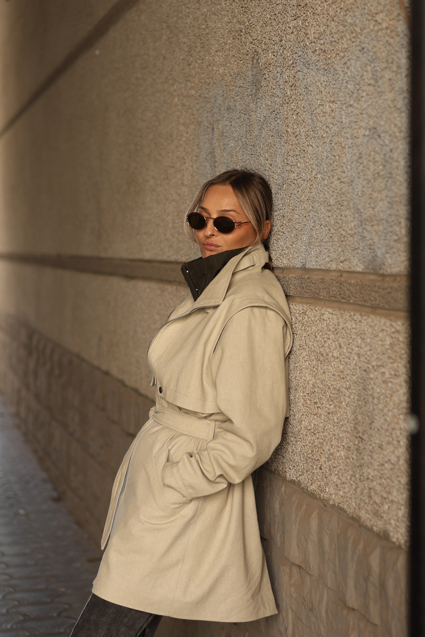 Тренч из денима прямого свободного кроя с поясом. Нежный светлый бежевый оттенок идеально сочетается с любым типом кожи. Модель оснащена удобными карманами спереди, стоячим воротником и манжетами, создающими современный образ. Фурнитура на изделии выполнена из металла. Под тренчем утепленный стеганный жилет, с высоким воротником и скрытыми кнопками. Жилет можно носить с любой верхней одеждой в качестве утеплителя.