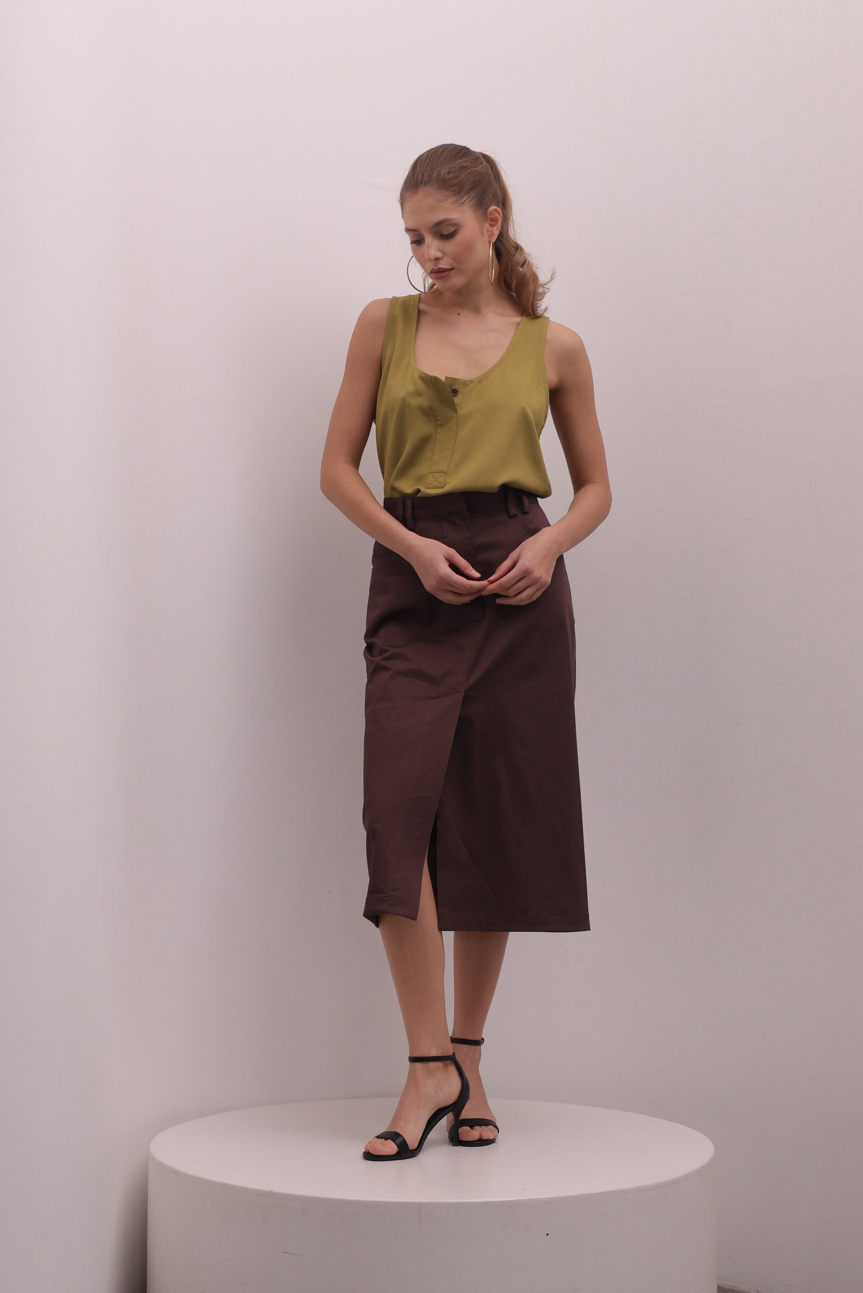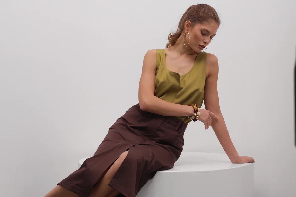 Юбка длины миди коричневого теплого оттенка, с отстрочкой по талии средней посадки.