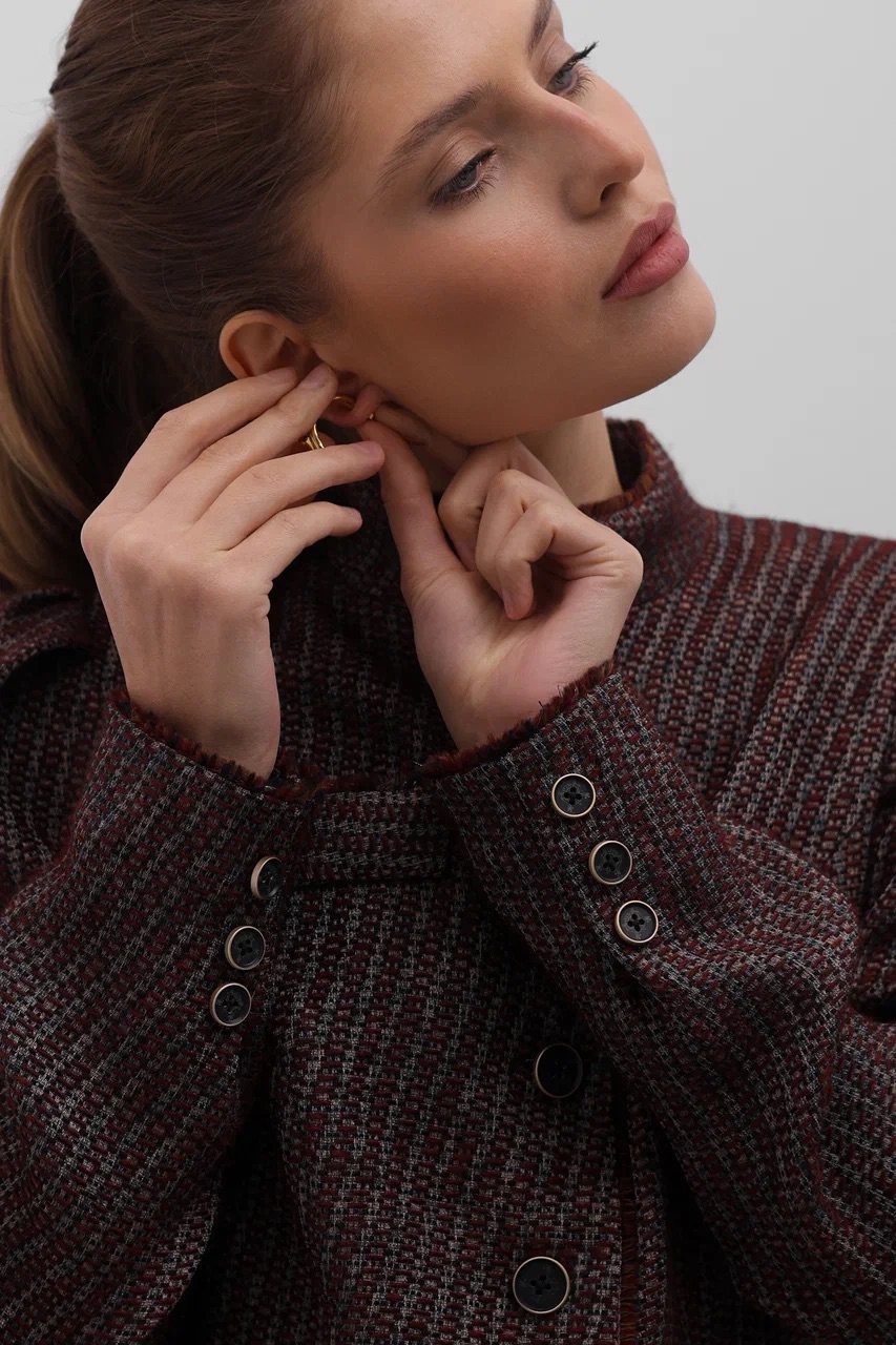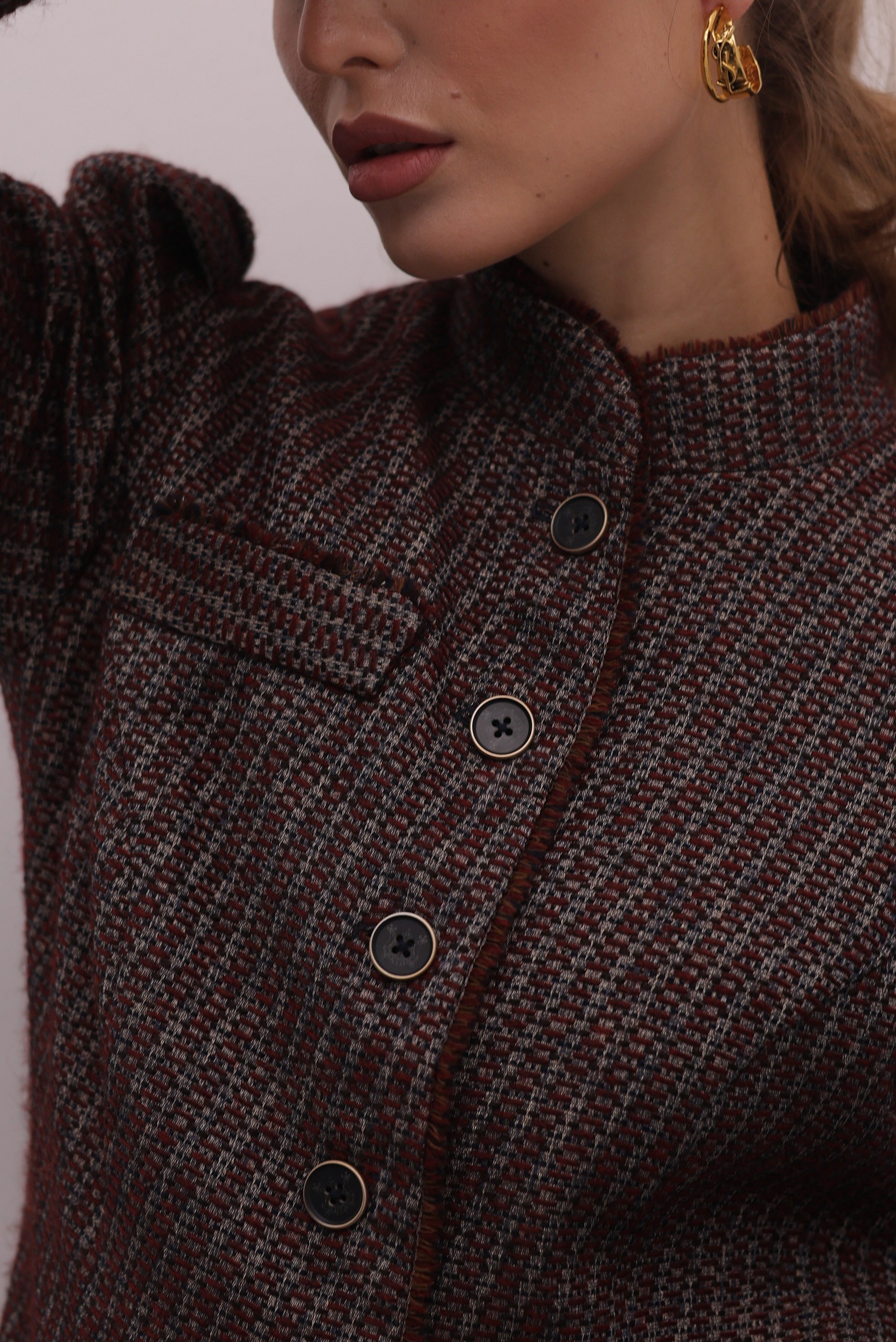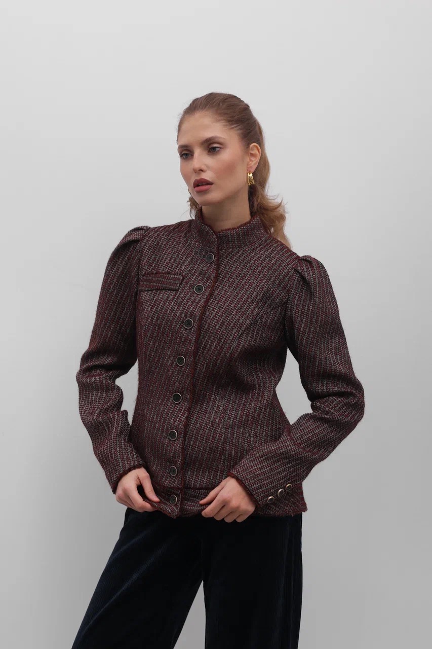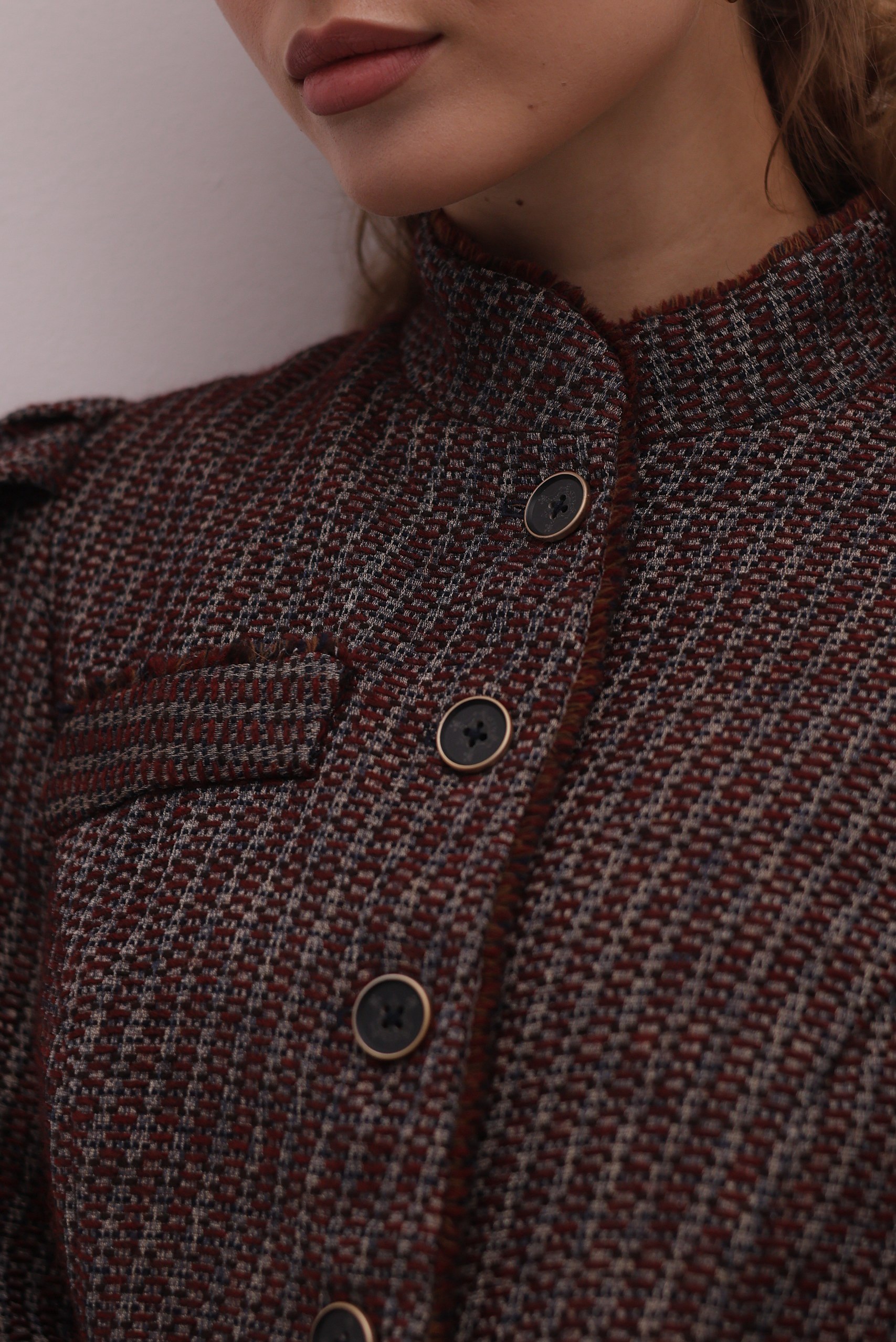 Элегантный жакет из плотного твида с выразительной фактурой в оттенках бордового, коричневого и серого. Приталенный силуэт подчёркивает фигуру, а мягко оформленные плечи добавляют образу архитектурности.